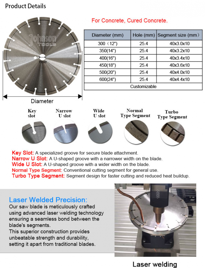 2. Thông tin kỹ thuật của Lưỡi cưa Turbo kim cương 500mm cho bê tông đã đóng rắn với hiệu quả tốt